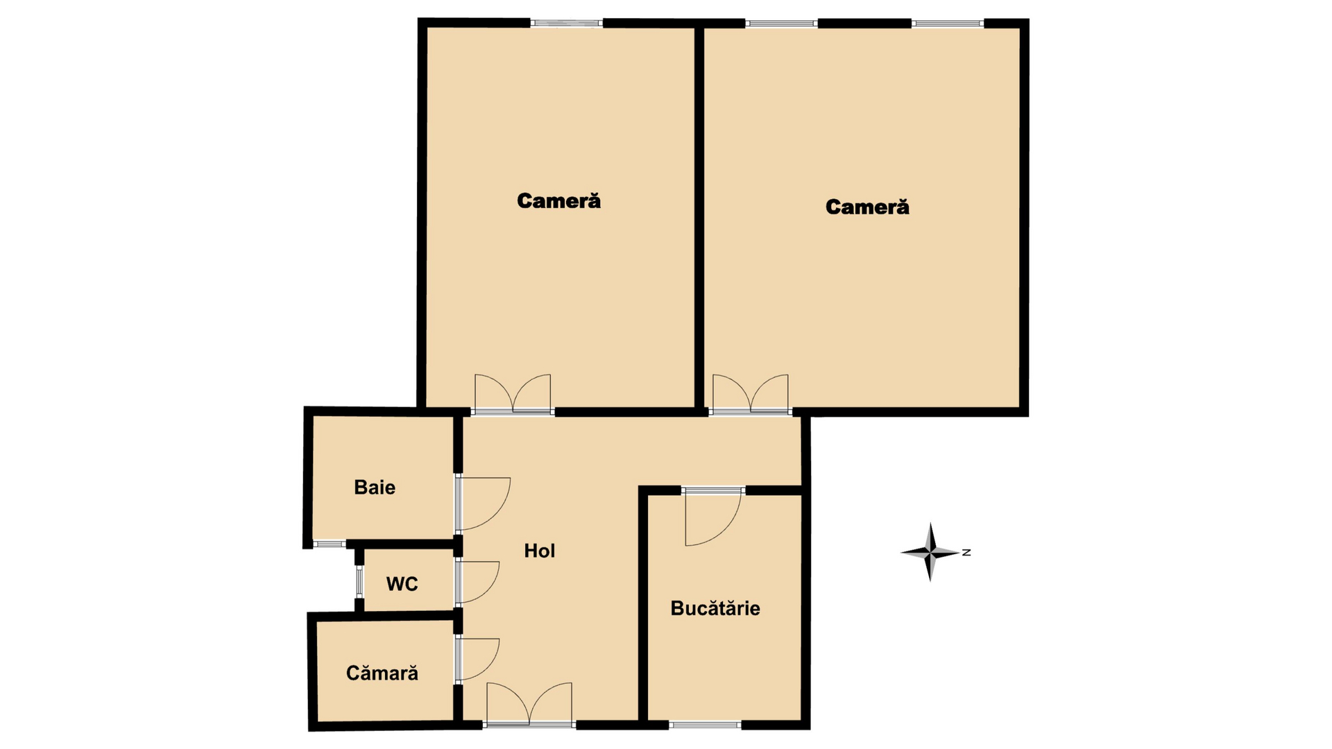 Compartimentarea este echilibrată și funcțională: două camere spațioase, bucătărie separată, antreu generos, baie, WC de serviciu și cămară pentru alimente — un mix ideal între confort și utilitate.